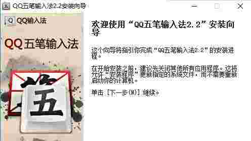 一、在本站下载QQ五笔输入法安装包,双击运行。之后就会打开QQ五笔输入法安装向导,如下图所示,点击”下一步“继续安装;