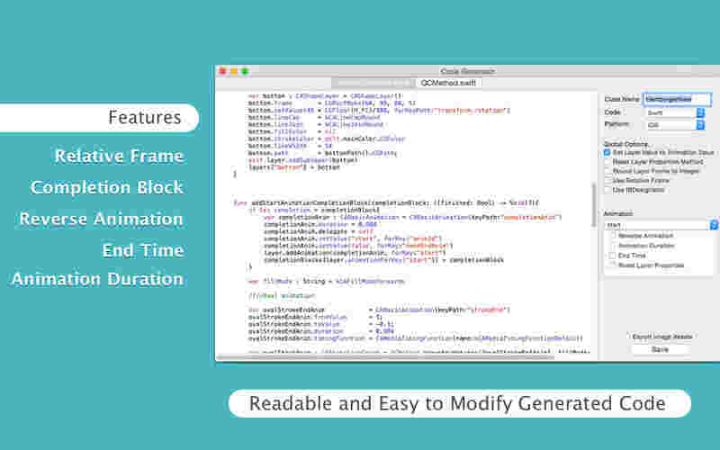 QuartzCode Mac版是一款非常实用的动画制作工具,软件功能强大,可以帮你创作非常漂亮的动画。可以快速生成iOS和Mac OS X的Objective-C和Swift代码,拥有六种类型和超过25种可动画属性,创建动画效果的可能性无限,大大节省了创建复杂动画的时间,感兴趣的小伙伴赶快下载使用吧!