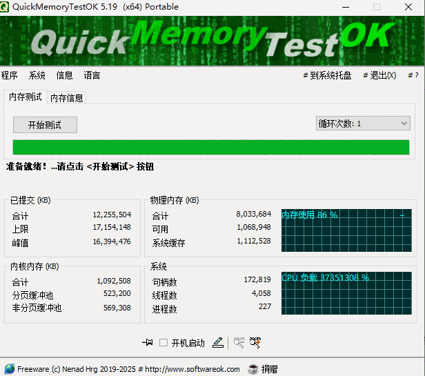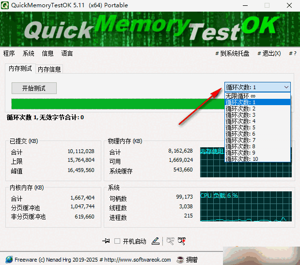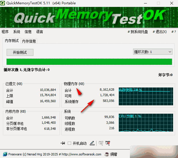 quickmemorytestok是一款可靠的内存检测工具。提供多种测试模式,快速检测内存稳定性,识别潜在问题。兼容多版本系统,免费使用满足个人及小型场景内存检测需求保障设备运行稳定性,这是一款很不错的软件,我们在日常生活中经常能够使用到,对该软件感兴趣的小伙伴千万别错过!