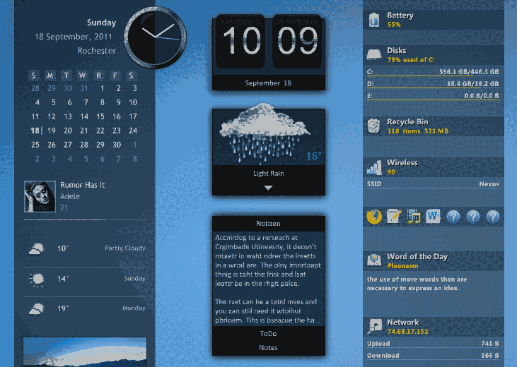 现在主打的皮肤,典雅的设计搭配很强大的主窗口,确实很容易上手。主窗口亮蓝色的部分点击可以打开对应的组件,暗蓝的部分用来切换组件的大小。中央的设置按钮可以方便地设置几个组件所需的变量。另外新加入的主题管理器RainThemes里面存了三套界面设置方案,不妨尝试一下。