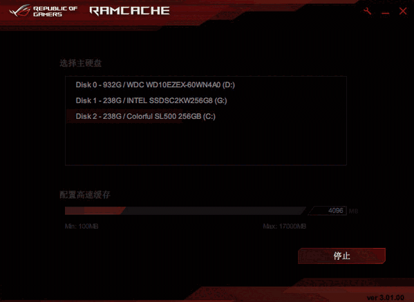 重新进入RAMCache之后软件会自动检测系统内存并列出可以用于做缓存的最大内存量,在硬盘列表栏中点击需要设置缓存的硬盘或者SSD,然后在下方设置合适的内存容量后点击“开始”即可,此时无需重新启动计算机。