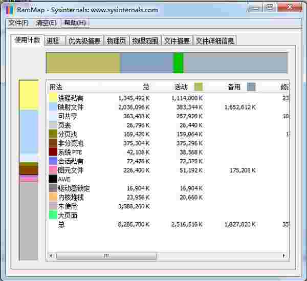 RAMMap是一个先进的物理内存空间分析工具,比较专业的内存分析器,RamMap用于展示系统和进程内存状态和利用率。它提供一个命名为“使用计数”的概要栏,它列出所有各种各样的系统内存分区,如分页池和非分页池、流程私密的、可共享的、硬盘空间、内核堆栈和映射文件。它还显示被称为Metafile的缓存文件内存空间的数量。