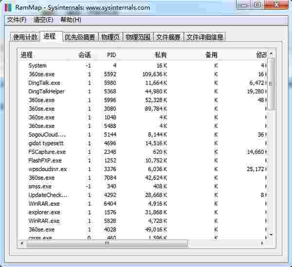RamMap还在“进程”栏中显示进程内在利用率。在这里你可以看到所有列出的进程,还有它们相应的私有内存利用率。数据还包括所有占用备用或修改页面列表的进程内存,还有用于页表项的内存量。