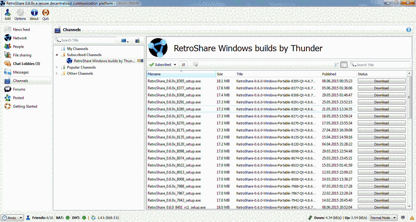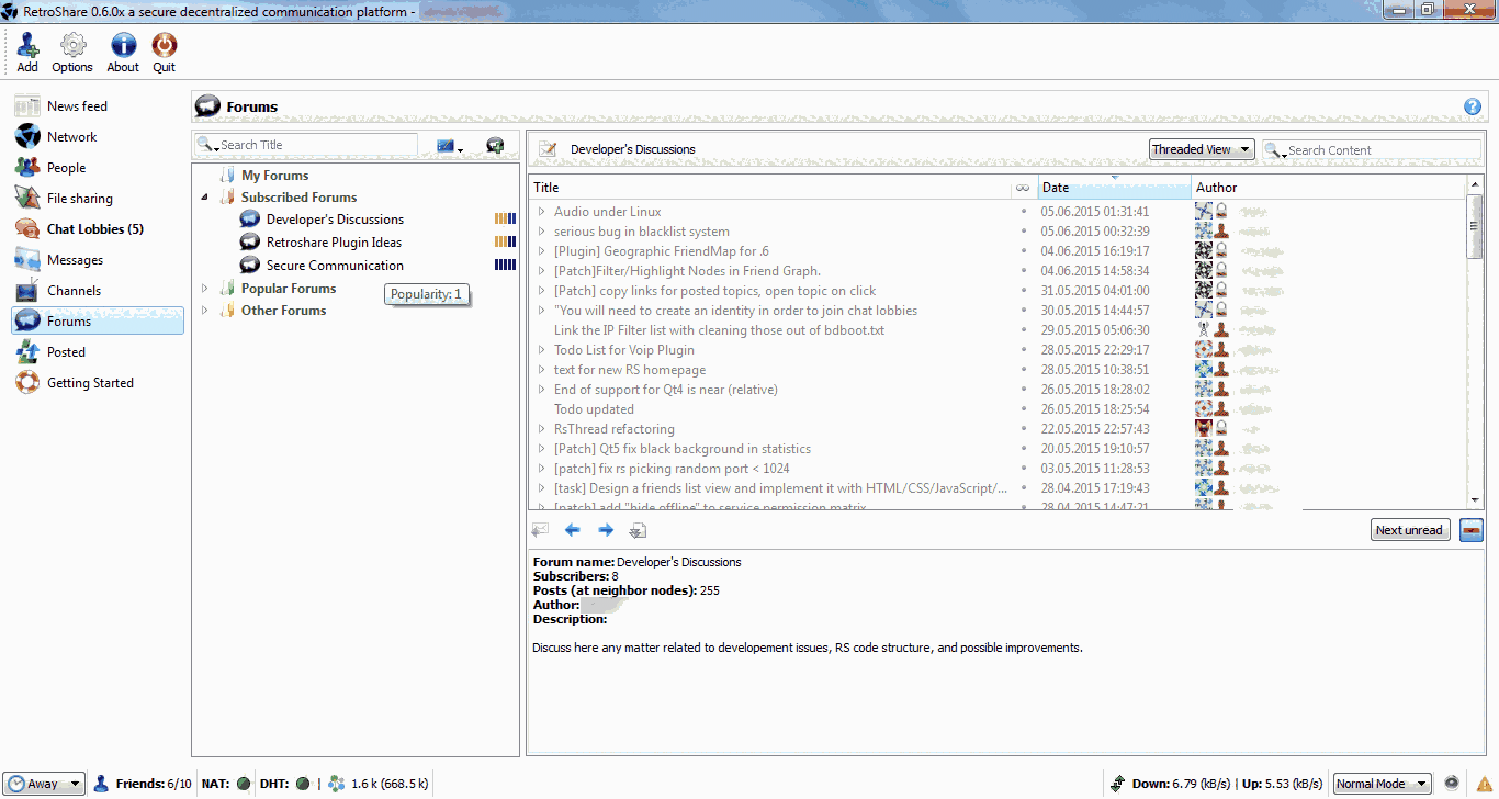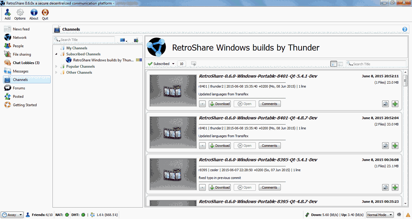 RetroShare 是一个开源的跨平台、私密和安全的去中心化通信平台。它使您可以安全地与朋友和家人聊天和共享文件,使用信任网络对同行进行身份验证,并使用OpenSSL加密所有通信。RetroShare 提供文件共享、聊天、消息、论坛和频道。