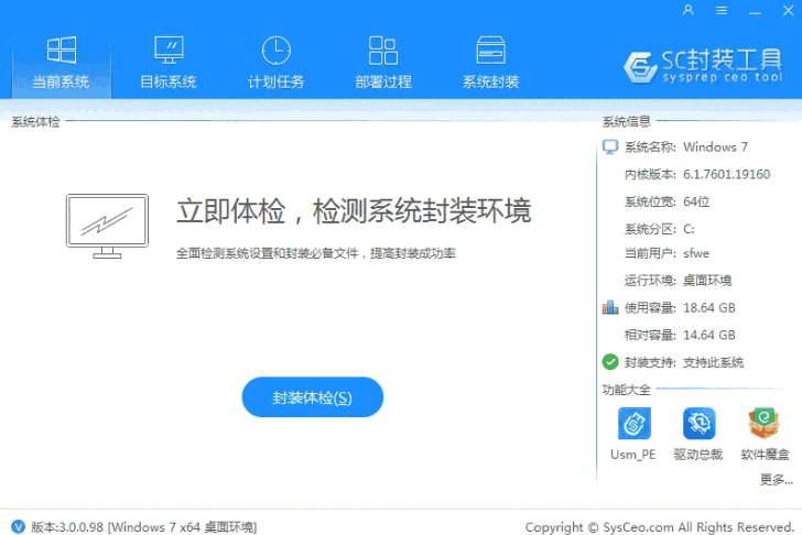 SC封装工具是一款功能丰富的系统封装工具,软件内含三种常见的封装模式,用户能自行选择想使用的模式。在进行封装之前软件还会将目标系统里面的设置都自动同步,通过同步来简化用户的操作,防止出现封装失败的情况,这是一款很不错的软件,我们在日常生活中都能使用,喜欢的可以下载!