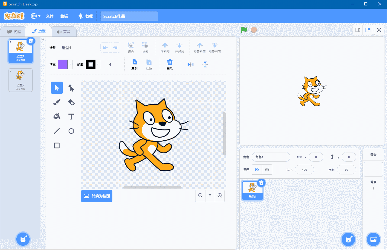 2、丰富的创作工具:利用角色管理、舞台设计、绘图编辑器、声音编辑器等功能,使界面更加美观有趣。