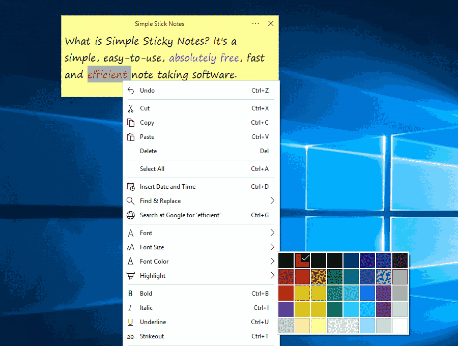 Simple Sticky Notes 是一款易于使用、免费、快速、高效的笔记软件,创建桌面的小贴纸功能,时刻提醒用户what should do!软件体积小巧,几乎不占用后台!启动速度快人一步,欢迎下载使用!