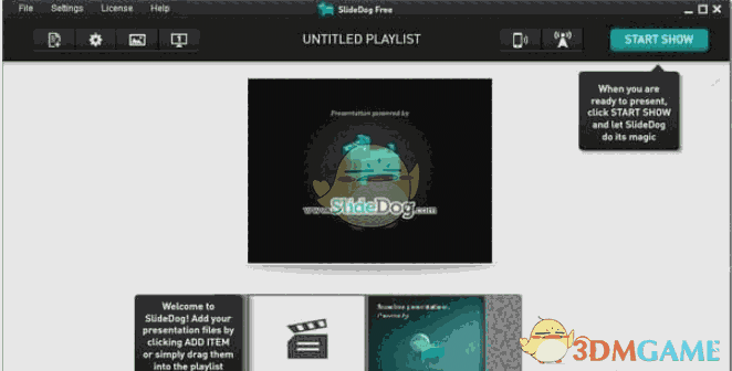SlideDog是一款轻量级好用的演示文稿制作软件,软件内置了强大的浏览功能,用户可以通过拖放的方式来进行文稿的制作,支持GIF, JPG, PNG, PDF, PPT, PPTX, PPS, 3GP, AVI, DV, FLV, MKV, MP4, MOV, MOD, MPEG等主流的多媒体方式,还可以嵌入Prezi演示文稿进行制作