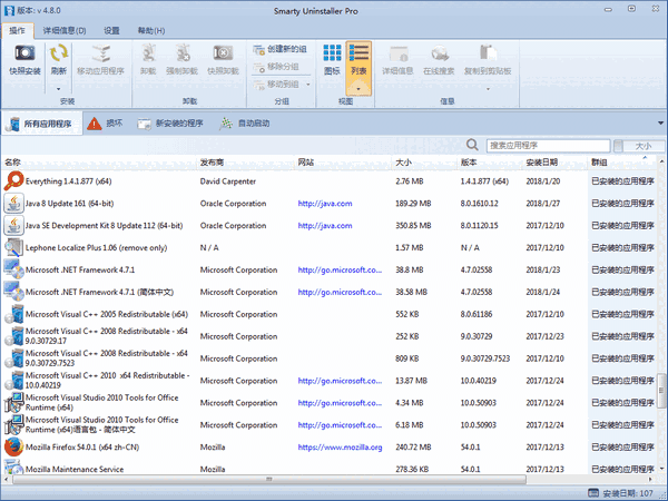 Smarty Uninstaller具有直观和现代化的界面,在主窗口中显示所有已安装的软件,损坏的安装,系统组件和Windows更新。
