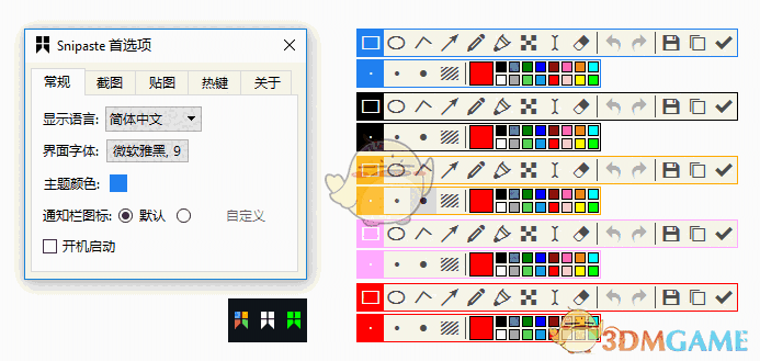 对大部分用户来说,第一次打开 Snipaste 后,将选项中的“开机启动”勾上,再根据自己的习惯调整一下全局热键,其他选项全使用默认设置即可。