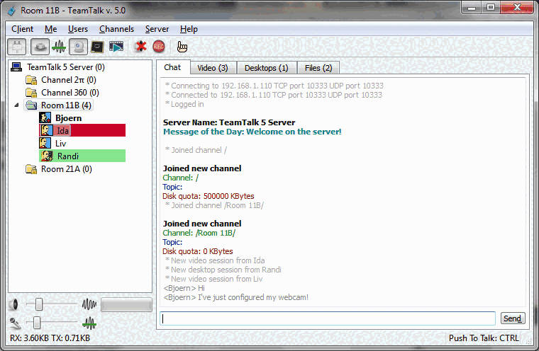 TeamTalk允许在因特网或局域网内的用户进行语音交流。你所需要的只是麦克和声卡。与其它因特网语音通讯软件不同,TeamTalk对参与会话的人数没有限制(这取决于你的带宽),语音延迟极小,因此能获得较好的沟通效果,这是一款很不错的软件,对该软件有需求的小伙伴快来下载体验吧!