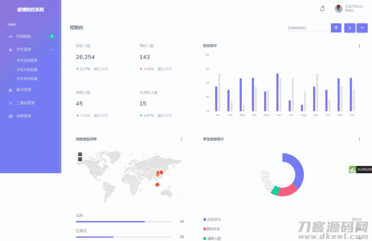 功能包括老师和学生角色权限,大数据图表展示,扫码进出校园,校园行程记录,生成二维码,学生管理,网站管理,学生签到打卡等功能等等。