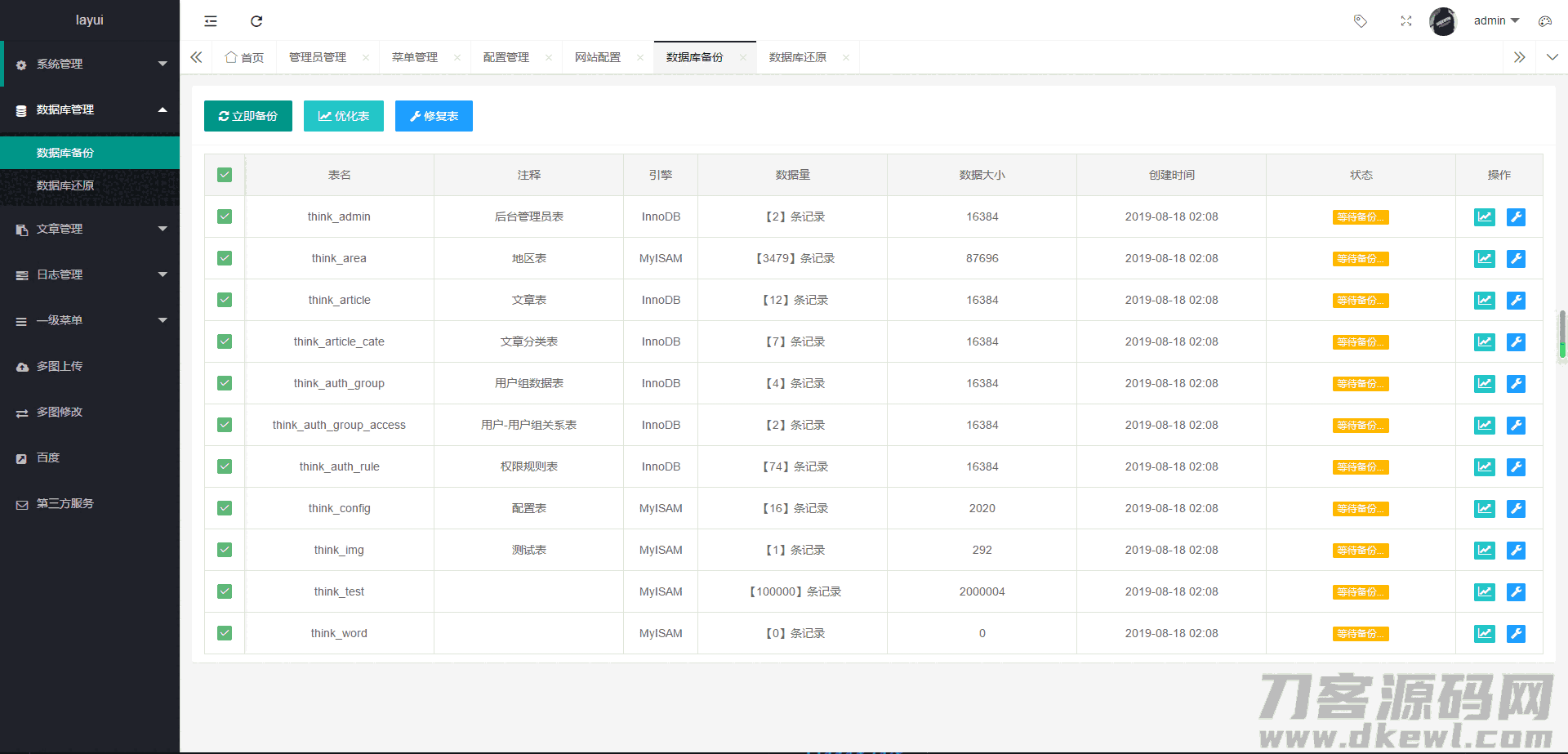 9080免费资源分享,PHP源码、网站源码、游戏源码、模板插件、软件工具、网络教程、为中国站长提供一站式源码下载 » thinkphp5+layui php后台管理系统-集成第三方短信附件等应用