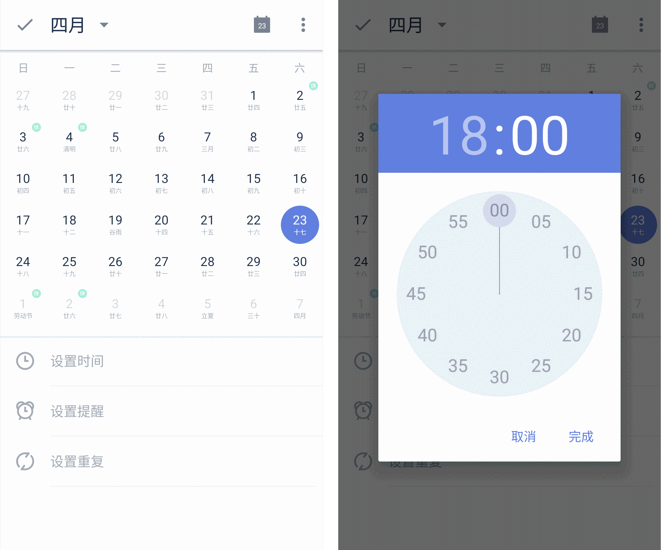 先选择日期,如果需要提醒,点击「设置时间」选择几点几分,最后点击页面左上角的「完成」图标即可成功设置提醒。
