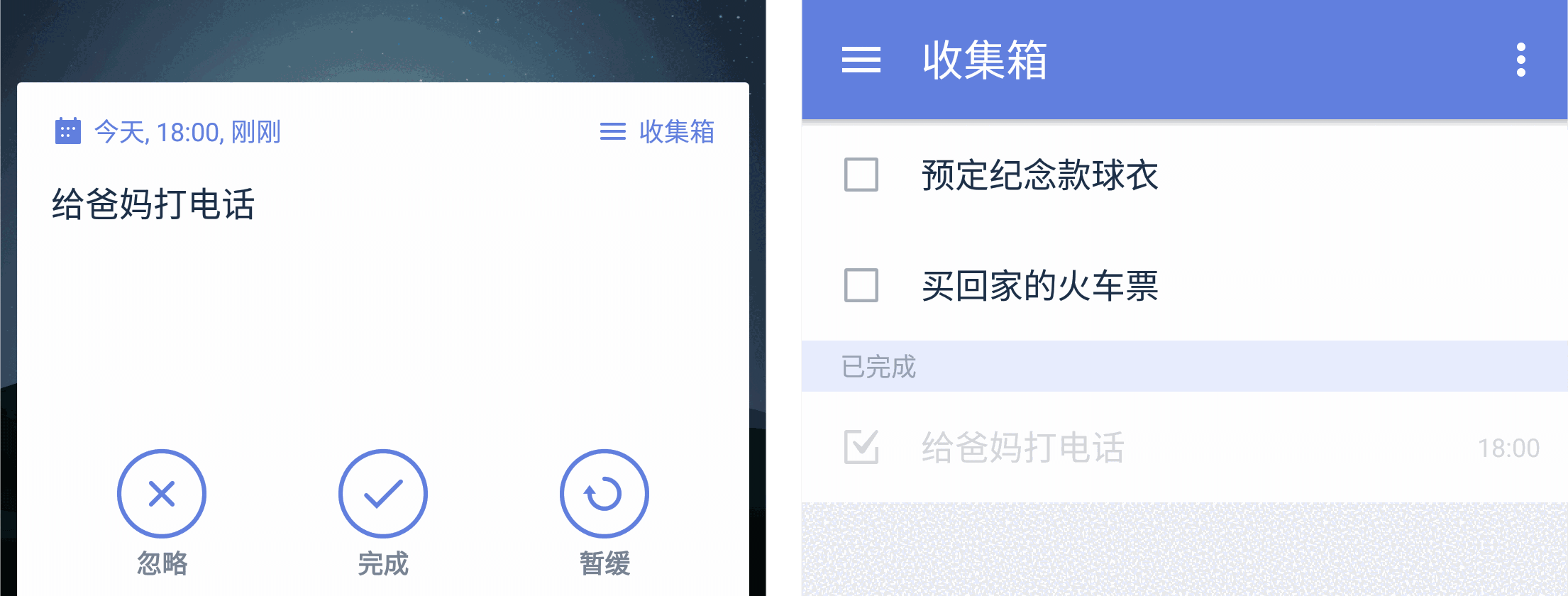 提醒响起后,点击弹窗下方的「完成」图标即可将任务打勾。或者在应用里点击任务左侧的小方框。