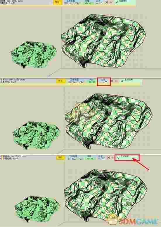 12、最后的生成状态区 有三种模式 从左往右 分别是 附带生成基座模型 取消原始的等高线轮廓线 生成一个被压平的等高线平面集 三项可均选 也可以单选