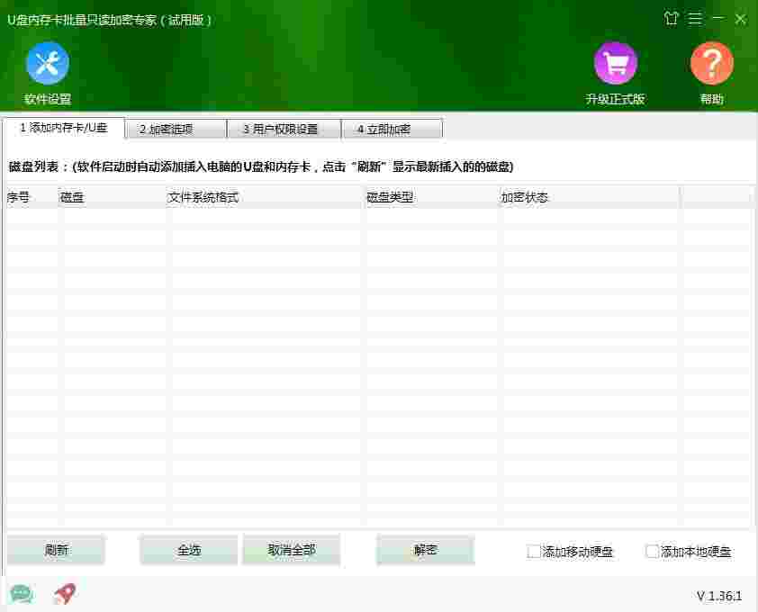 1.运行U盘内存卡批量加密专家后,可以看到如下界面。软件里面显示的磁盘是电脑上已经插入的U盘或内存卡,如果列表中没有您的磁盘,请确定U盘/内存卡插入正确,然后点击【刷新】按钮。(软件也可以加密移动硬盘和本地硬盘)
