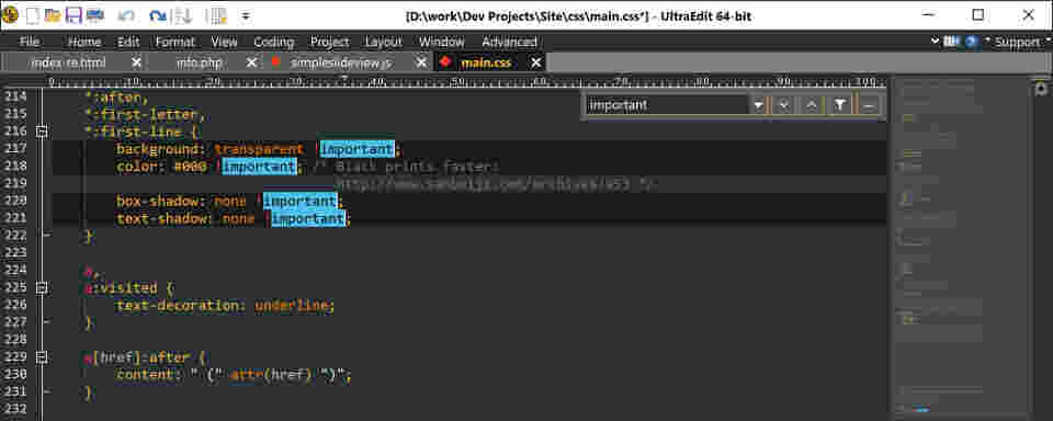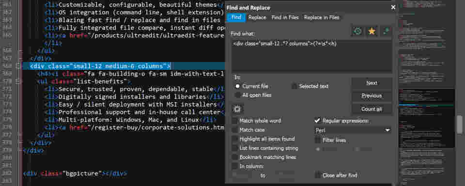 UltraEdit 的无所不知的搜索功能可以跨文件夹和目录查找文件,甚至可以在 4GB 的文件中查找文件。使用各种筛选器(如正则表达式)来微调搜索