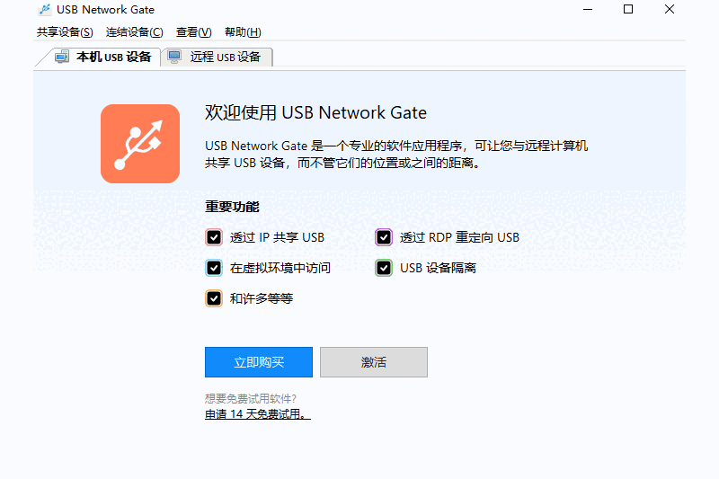 USB Network Gate是一款专业的远程共享的软件工具,软件通过wifi连接usb设备、支持远程操控和共享usb设备。非常方便快捷,软件界面简约,布局直观清晰。操作简单,容易上手,是一款十分实用的工具。