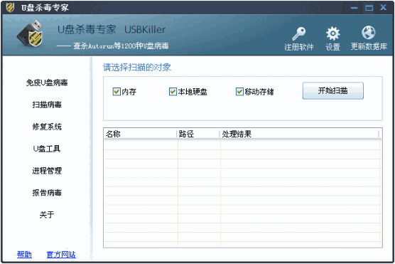 1、 打开u盘病毒专杀工具(USBKiller)主界面,点击“开始扫描”出现如下所示界面。