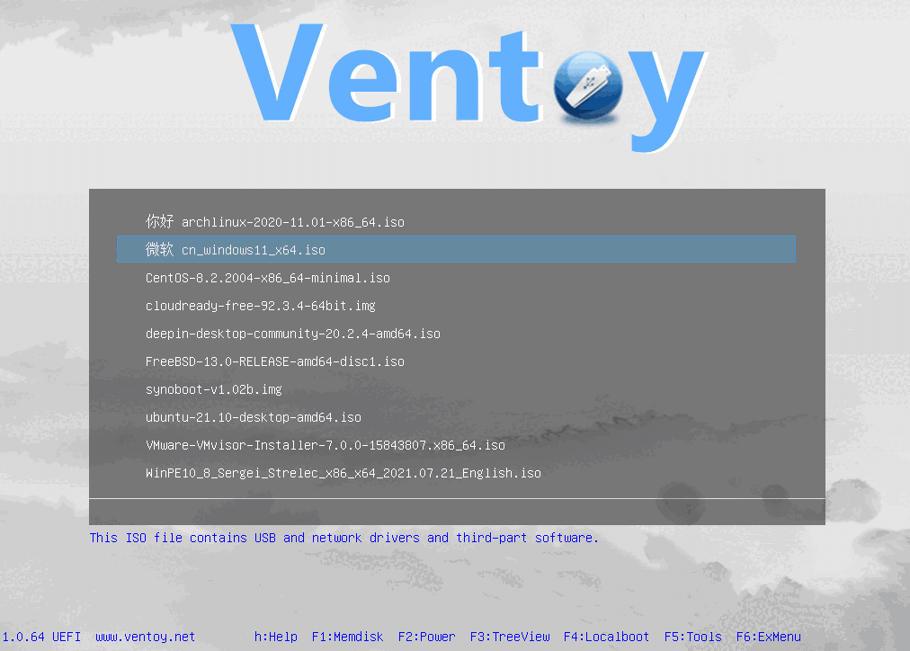 Ventoy 会给你一个启动菜单来选择它们。传统 BIOS 和 UEFI 都以相同的方式支持。测试了 420+ 个 ISO 文件。ventoy 引入了“Ventoy Compatible”的概念,可以支持任何 ISO 文件。