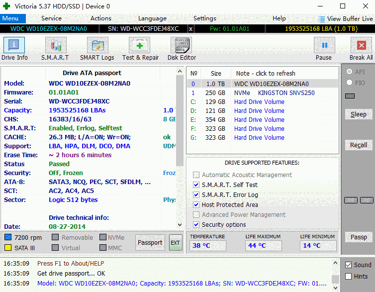 在应用程序可以分析的详细信息中,您可以找到硬盘的型号、磁盘大小、功能和总大小,但您也可以找到更高级的属性,如S.M.A.R.T属性(自我监控、分析和报告技术),包括原始读取错误率、旋转次数、搜索错误或率、启动/停止计数和通电时间。