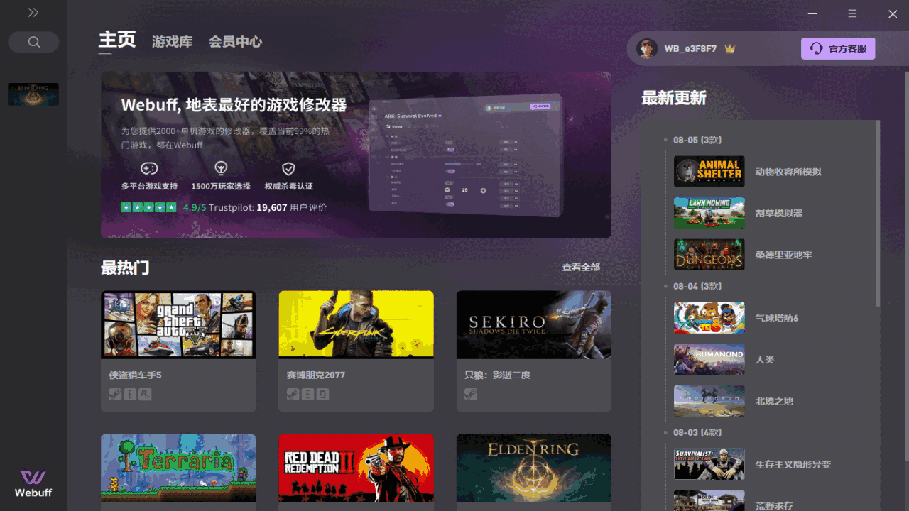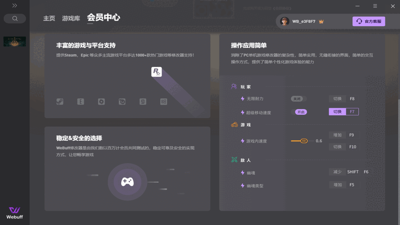 WeBuff修改器官方正版是一款功能强大的单机游戏修改器软件,软件一键加buff、操作更便捷、功能更全面,功能包括无限生命、无限金钱、无限子弹、无敌模式、超级速度、超级伤害等,包含艾尔登法环修改器、泰拉瑞亚修改器、荒野大镖客修改器、看门狗修改器、赛博朋克2077修改器、GTA5修改器等上千款热门单机游戏修改器,玩家可大大提高游戏体验,感兴趣的赶快下载使用吧!