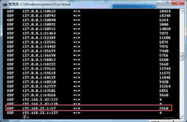 2、然后运行netstat -a -p udp -o(回车)这个命令符查看占用端口的程序,并找到占用192.168.23.1(24.1~33.1)的67端口的程序,记住它的PID。