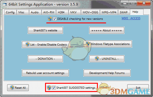 第一次运行Win7codecs时,程序会自动完成一些设置,无需理会。之后请勾选位于程序窗口靠下位置的【Shark007 SUGGESTED settings】选项。这个选项可以自动的完成部分工作。然后请切换至【Help】页,勾选【DISABLE checking for new versions】选项。Win7codecs升级比较频繁,如果不存在待解决的问题,则无需跟随每个版本进行升级。
