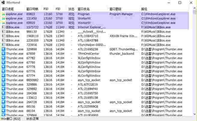 查看窗口进程,窗口句柄,pid,fid,状态,窗口类名,窗口题目,路径。