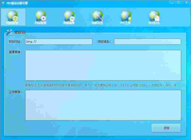 3、点击工具栏“网站增加”,找一个目标网站(欲镜像的网站),把网址填入“目标网址”中,前面要加http://